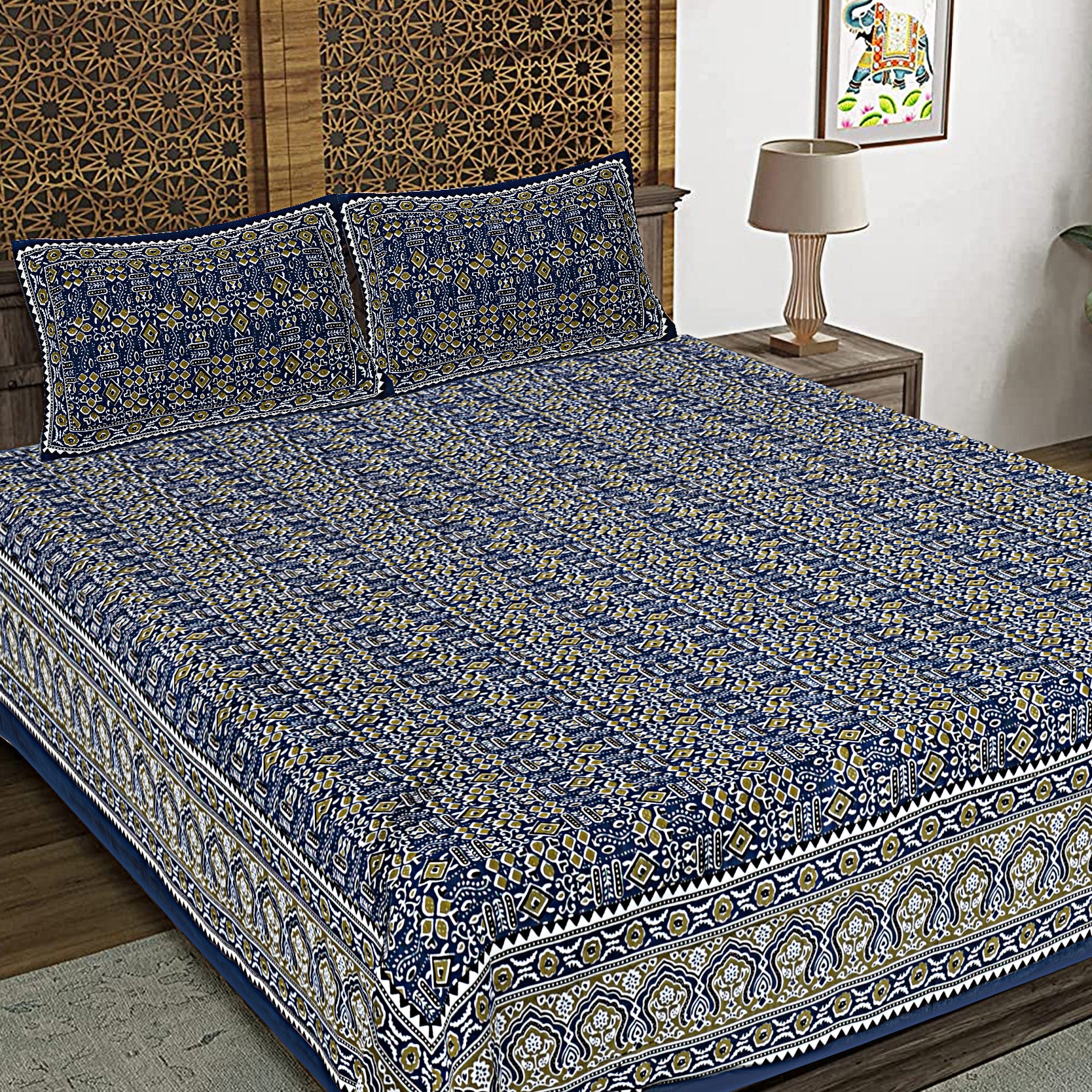 Style your bedroom with this vibrant cotton jaipuri print bedsheet set exclusively designed to make artsy statement. The jaipuri-printed bed sheets feature traditional-themed floral patterns in lively hues. Also, the 100% cotton fabric ensures skin-friendliness, easy wash ability and color-fastness. A fine fusion of both comfort and design- this vibrant and ethnic range of bed sheets is all you need for a restful sleep in all the seasons.