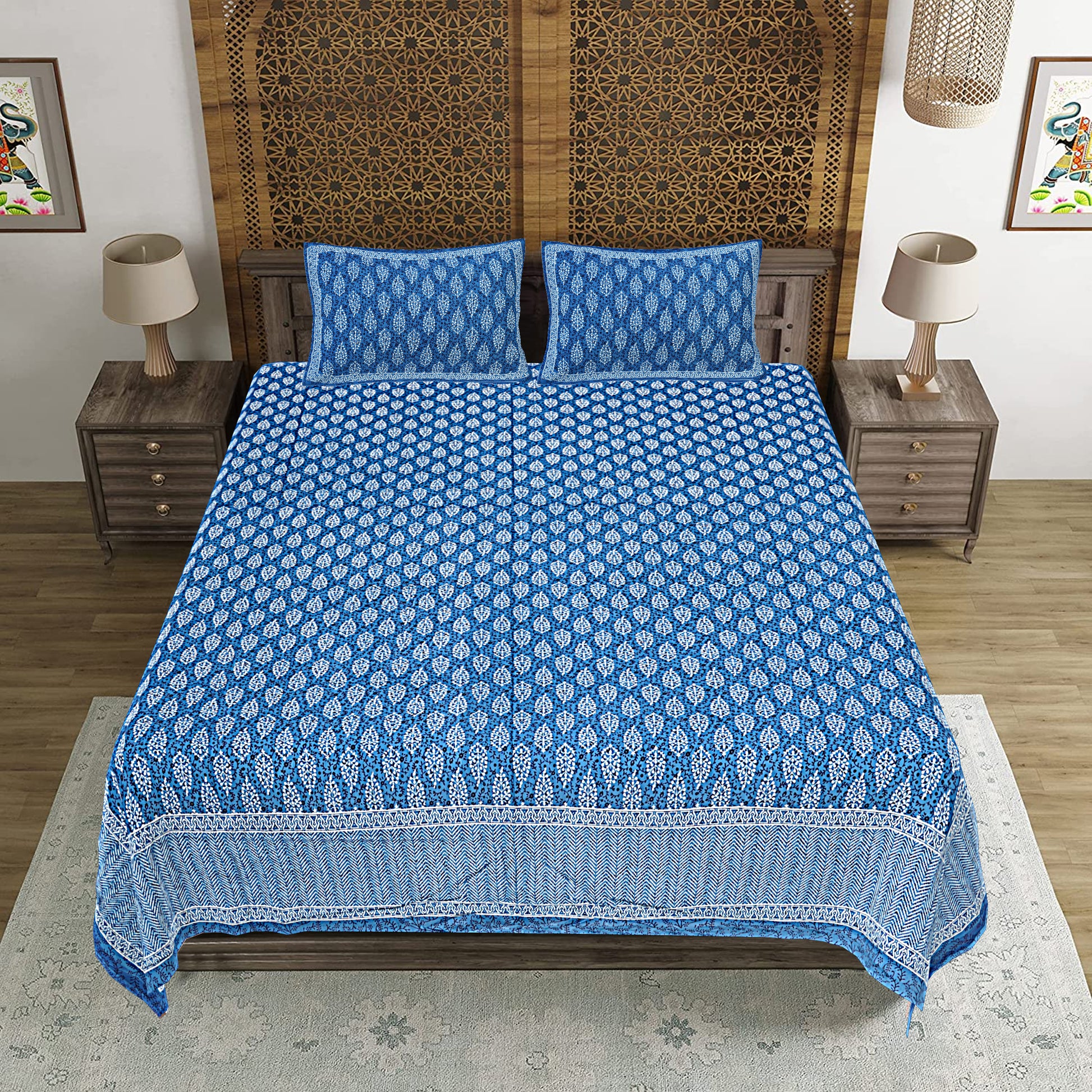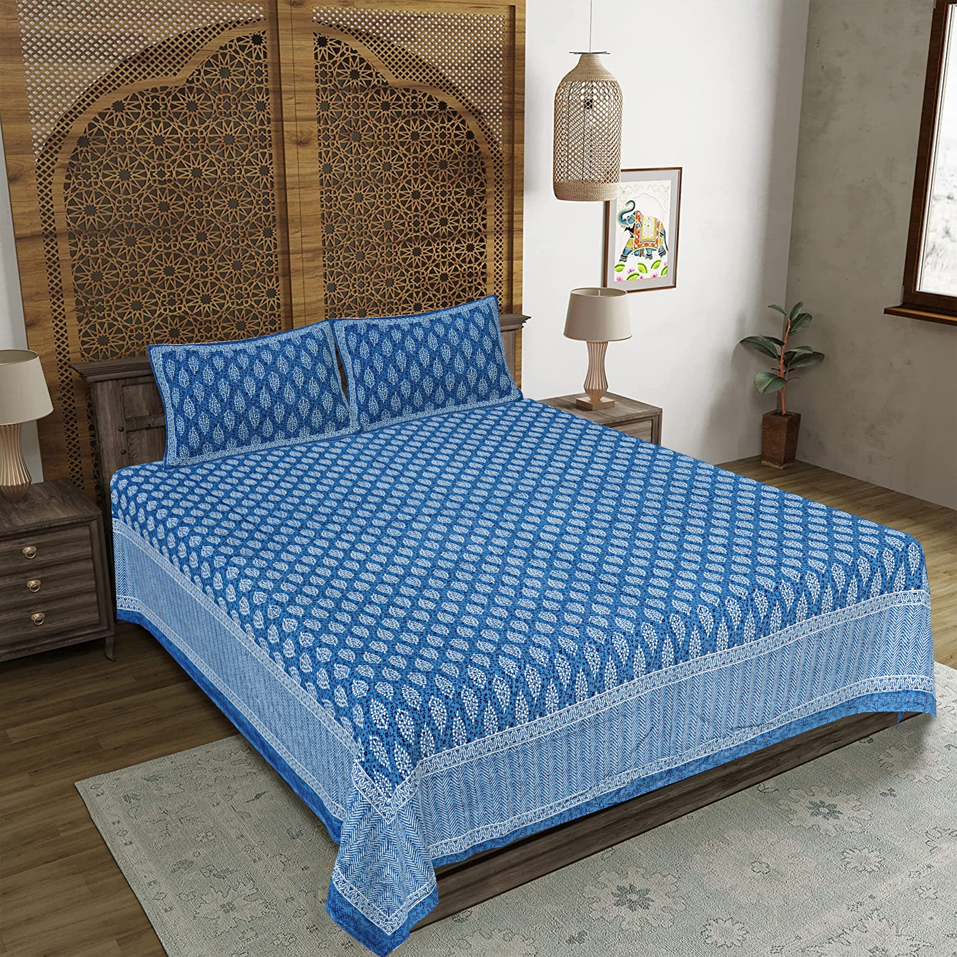 Style your bedroom with this vibrant cotton jaipuri print bedsheet set exclusively designed to make artsy statement. The jaipuri-printed bed sheets feature traditional-themed floral patterns in lively hues. Also, the 100% cotton fabric ensures skin-friendliness, easy wash ability and color-fastness. A fine fusion of both comfort and design- this vibrant and ethnic range of bed sheets is all you need for a restful sleep in all the seasons.