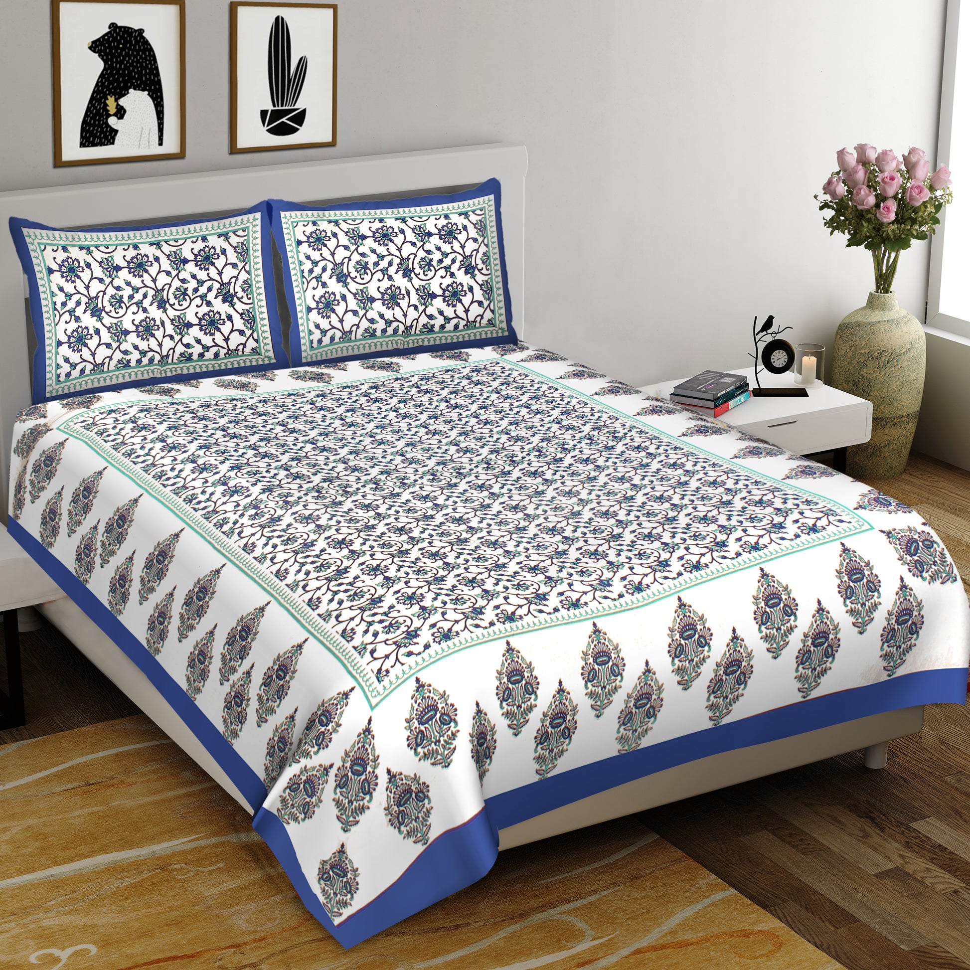 Style your bedroom with this vibrant cotton jaipuri print bedsheet set exclusively designed to make artsy statement. The jaipuri-printed bed sheets feature traditional-themed floral patterns in lively hues. Also, the 100% cotton fabric ensures skin-friendliness, easy wash ability and color-fastness. A fine fusion of both comfort and design- this vibrant and ethnic range of bed sheets is all you need for a restful sleep in all the seasons.