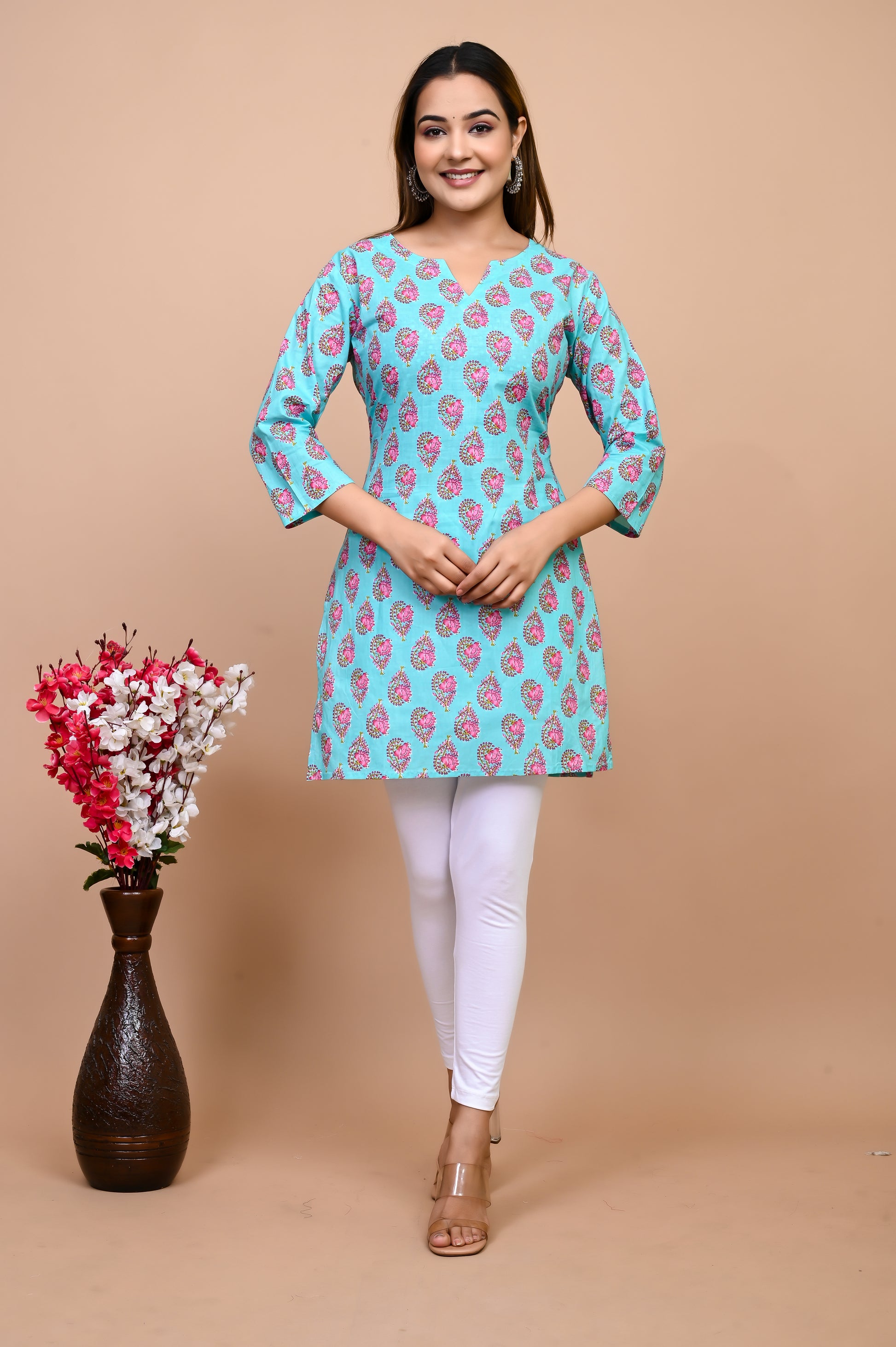Jaipuri Bright Sky Flower 100% Cotton Short Kurti
