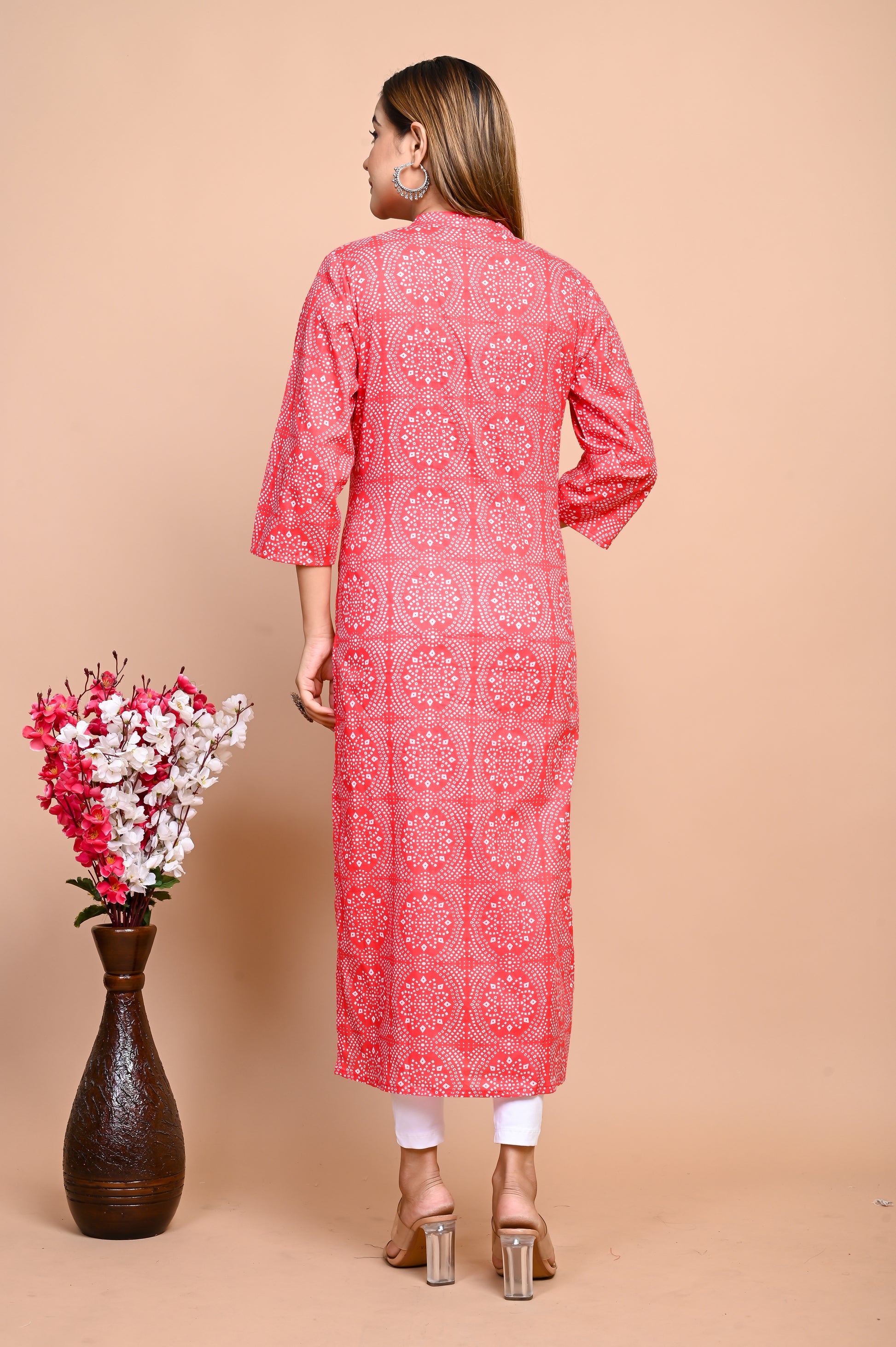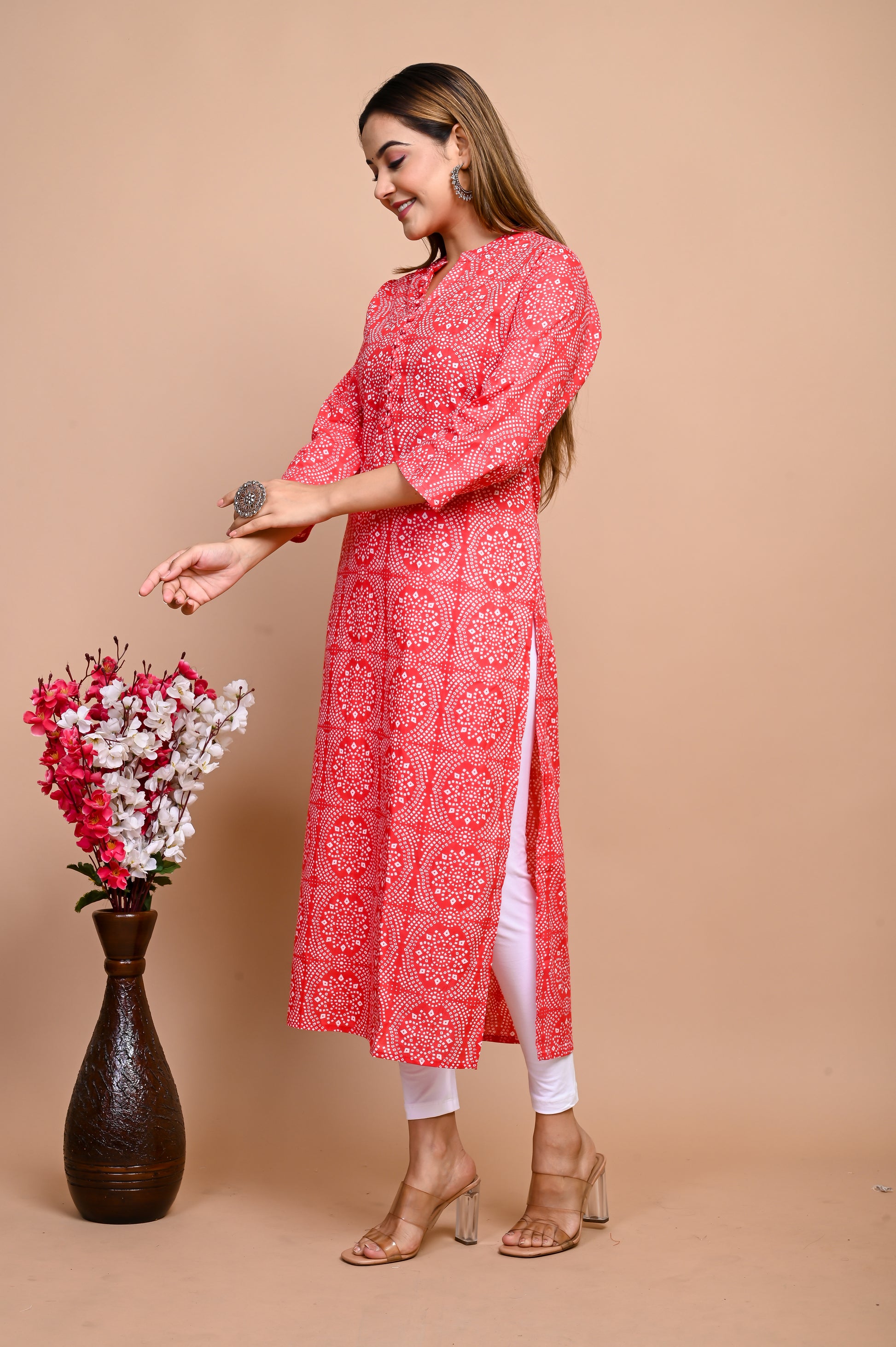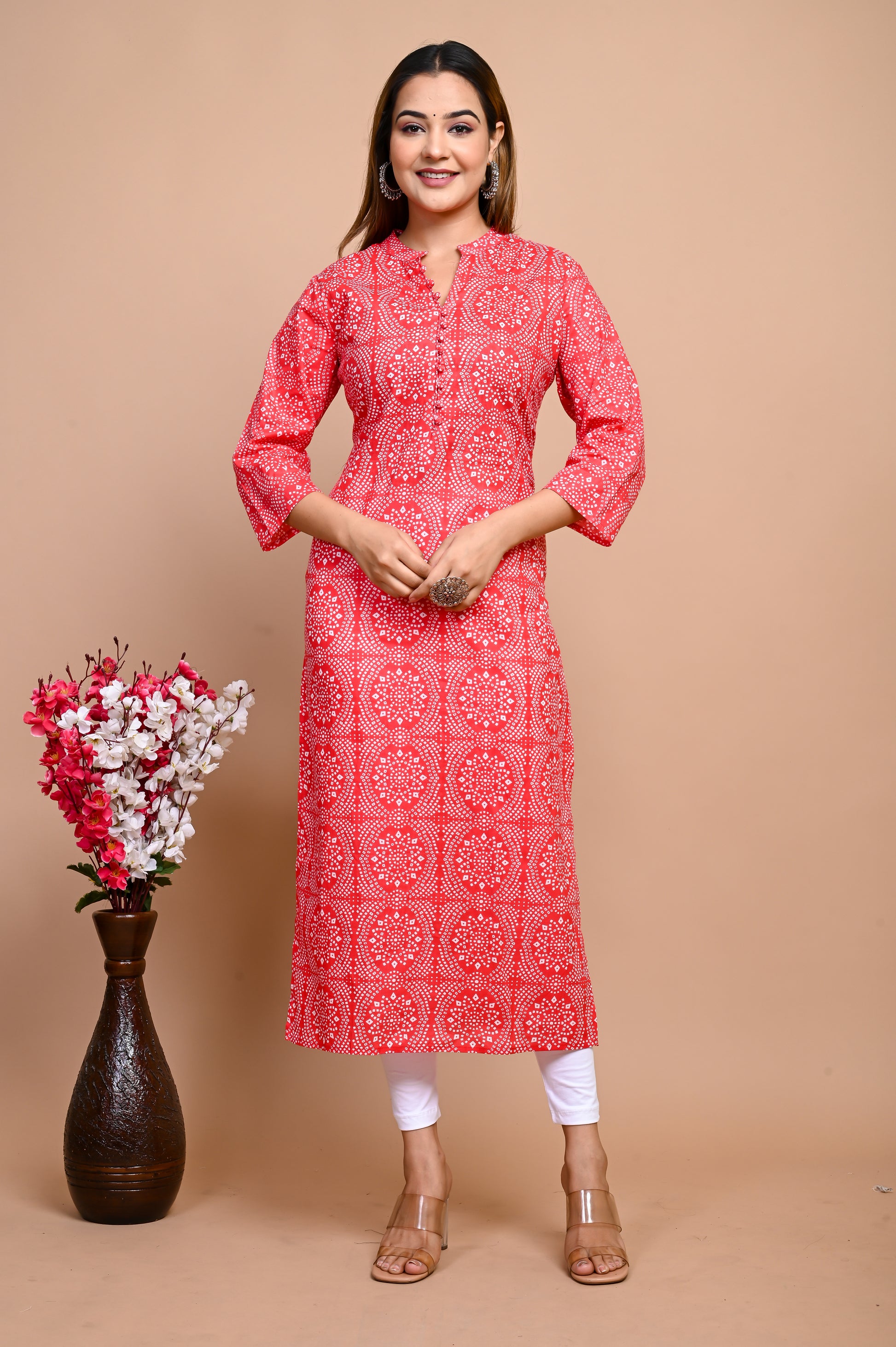 Jaipuri Red Bandhani Colour Jaal Print 100% Cotton Straight Kurti