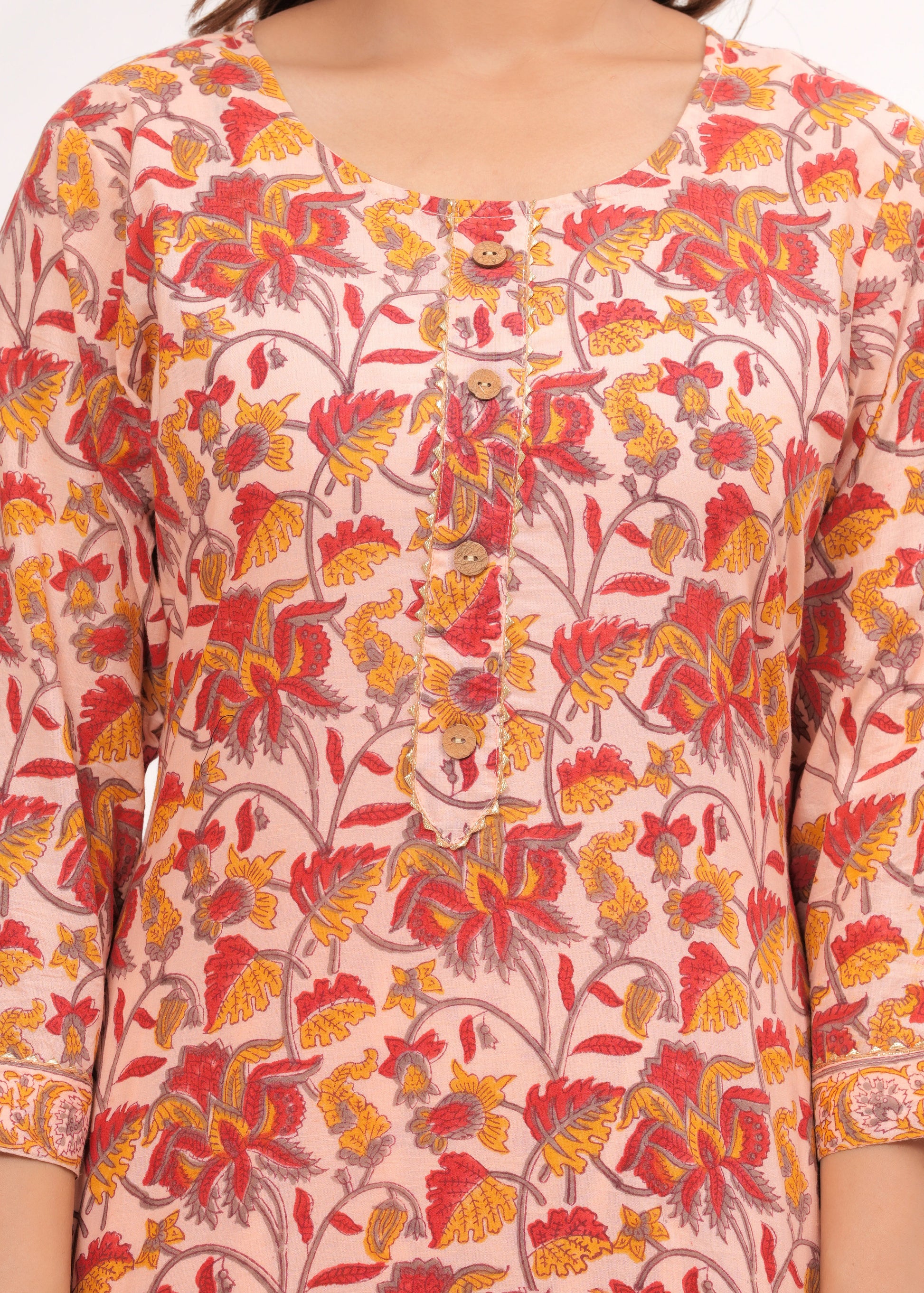 Peach Floral Jaal Hand Block Printed Cotton Suit Set