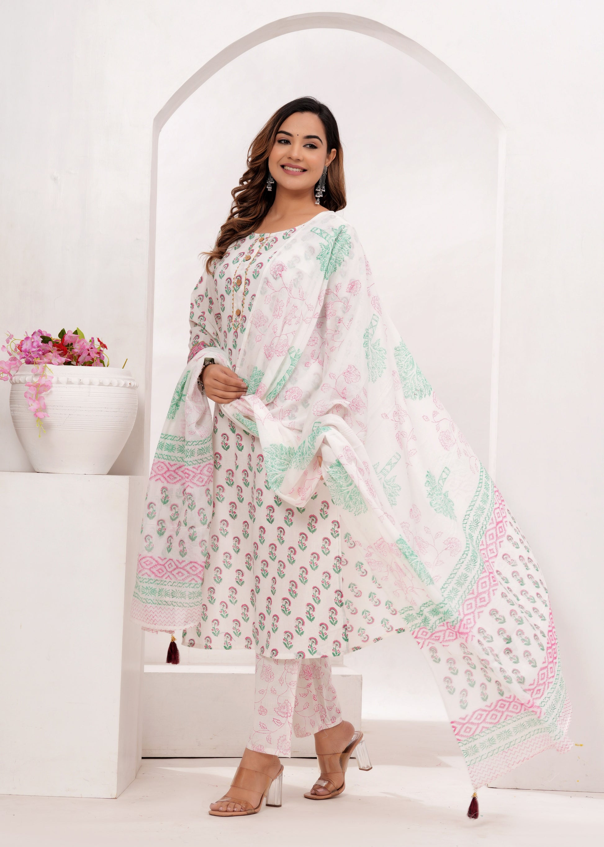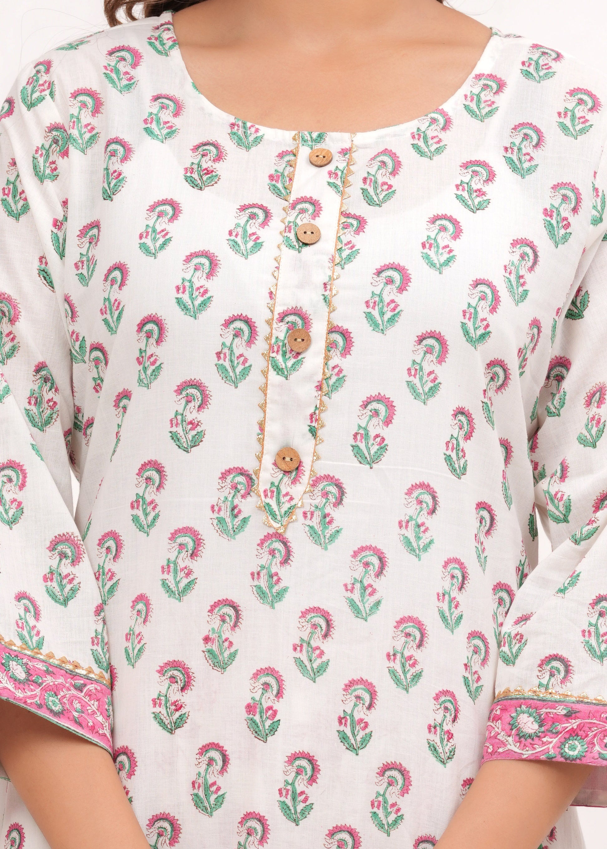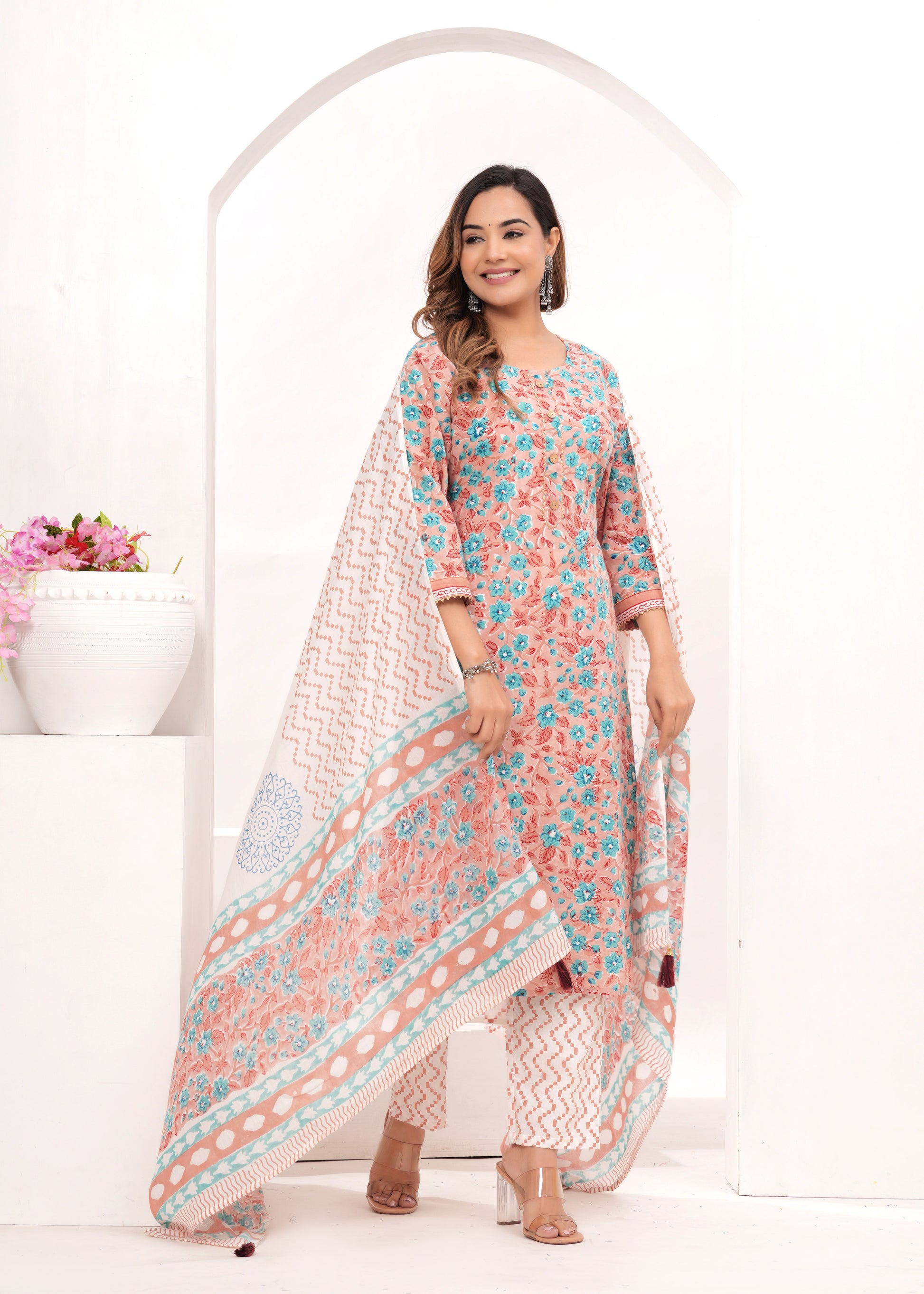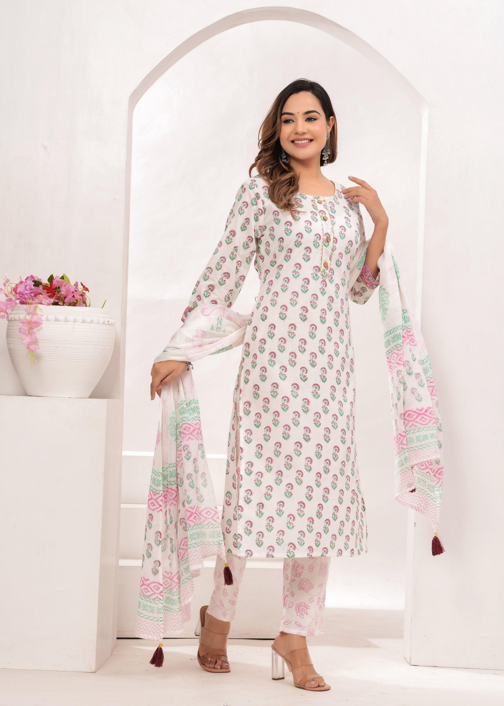 Show off your refined taste in ethnic wear with out beautiful hand made suits. The straight suit set Kurta complements the look, and Mul Mul dupatta makes you look regal. The 3/4 sleeves go well with the print. Style the suit with silver Jhumkis and matching Kangans for an evening function.