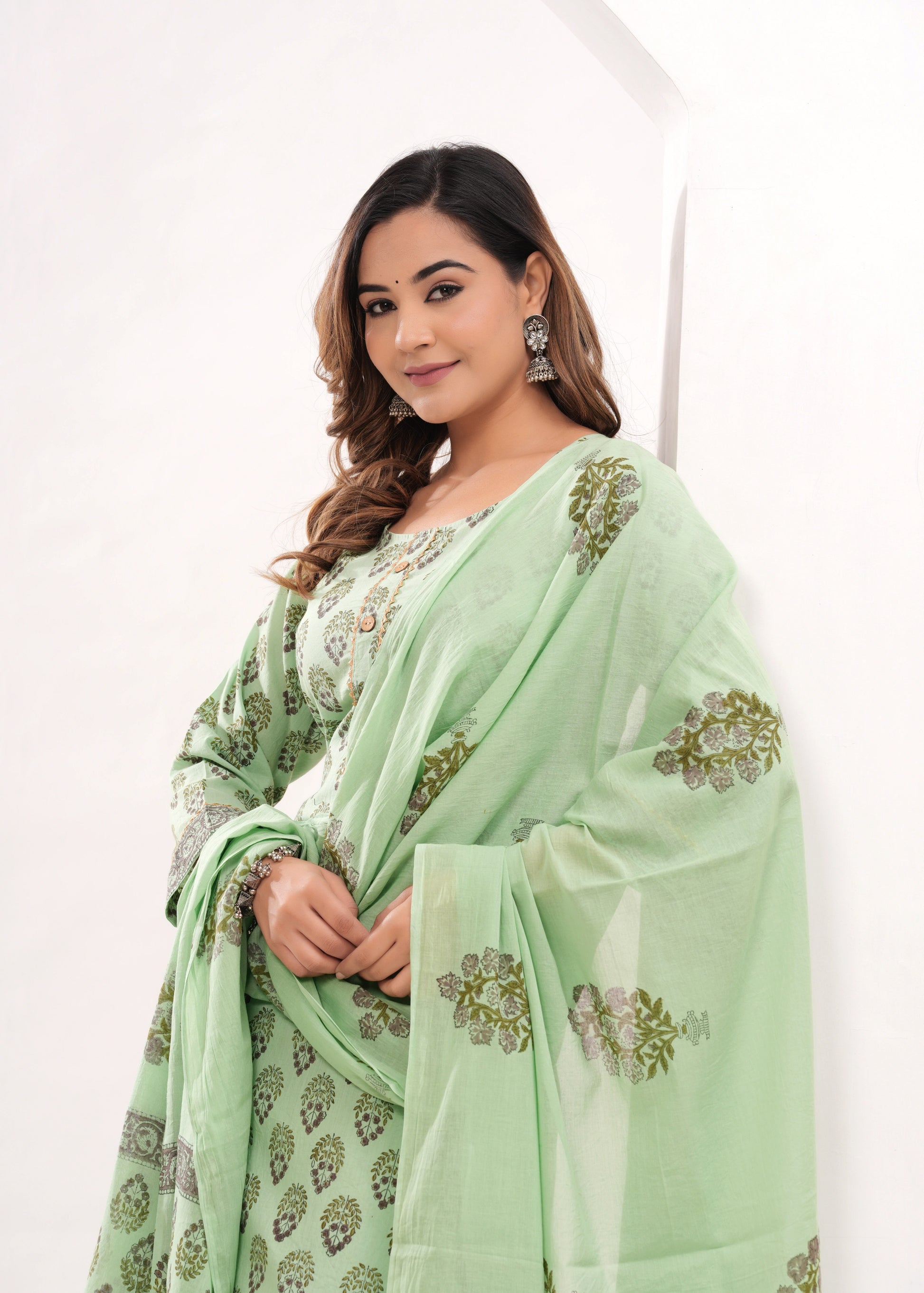 Show off your refined taste in ethnic wear with out beautiful hand made suits. The straight suit set Kurta complements the look, and Mul Mul dupatta makes you look regal. The 3/4 sleeves go well with the print. Style the suit with silver Jhumkis and matching Kangans for an evening function.