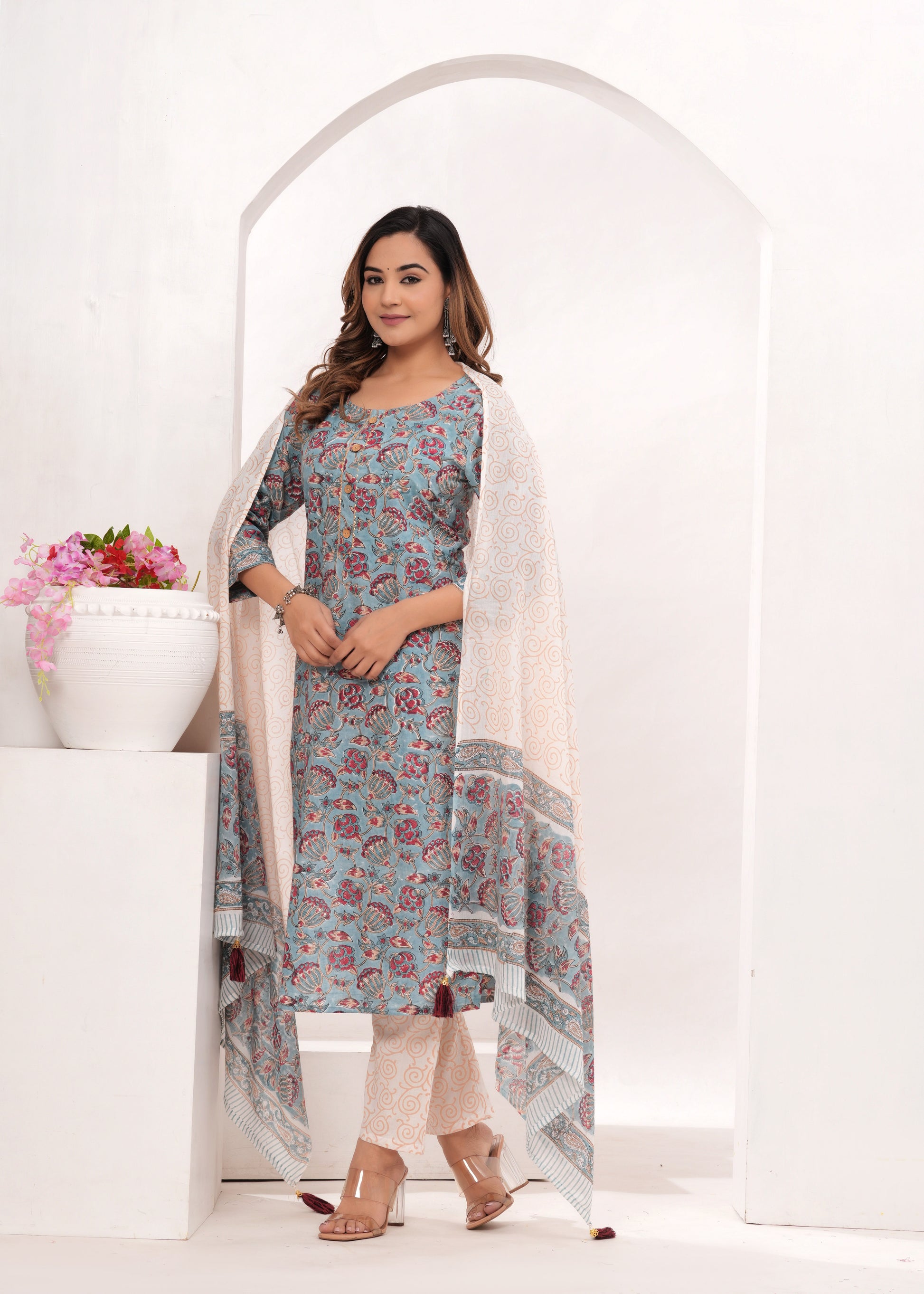 Show off your refined taste in ethnic wear with out beautiful hand made suits. The straight suit set Kurta complements the look, and Mul Mul dupatta makes you look regal. The 3/4 sleeves go well with the print. Style the suit with silver Jhumkis and matching Kangans for an evening function.