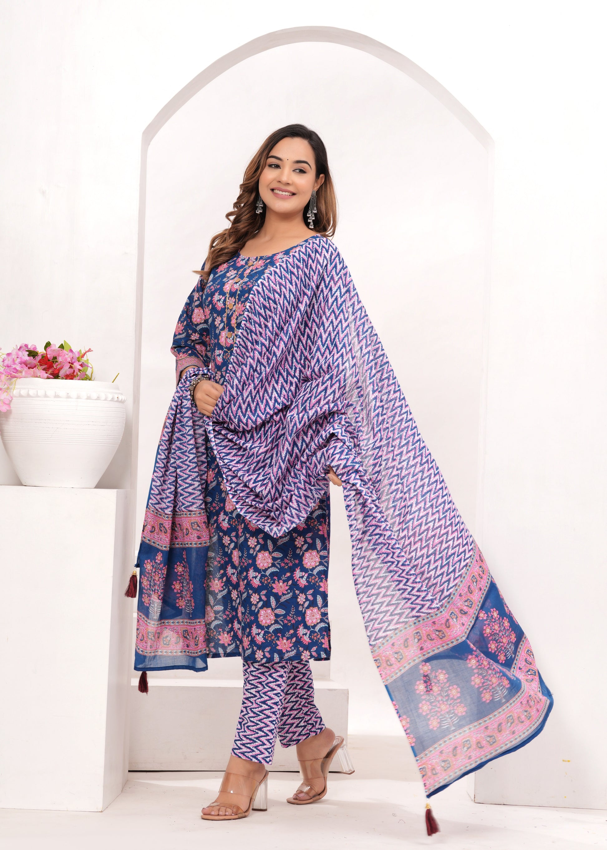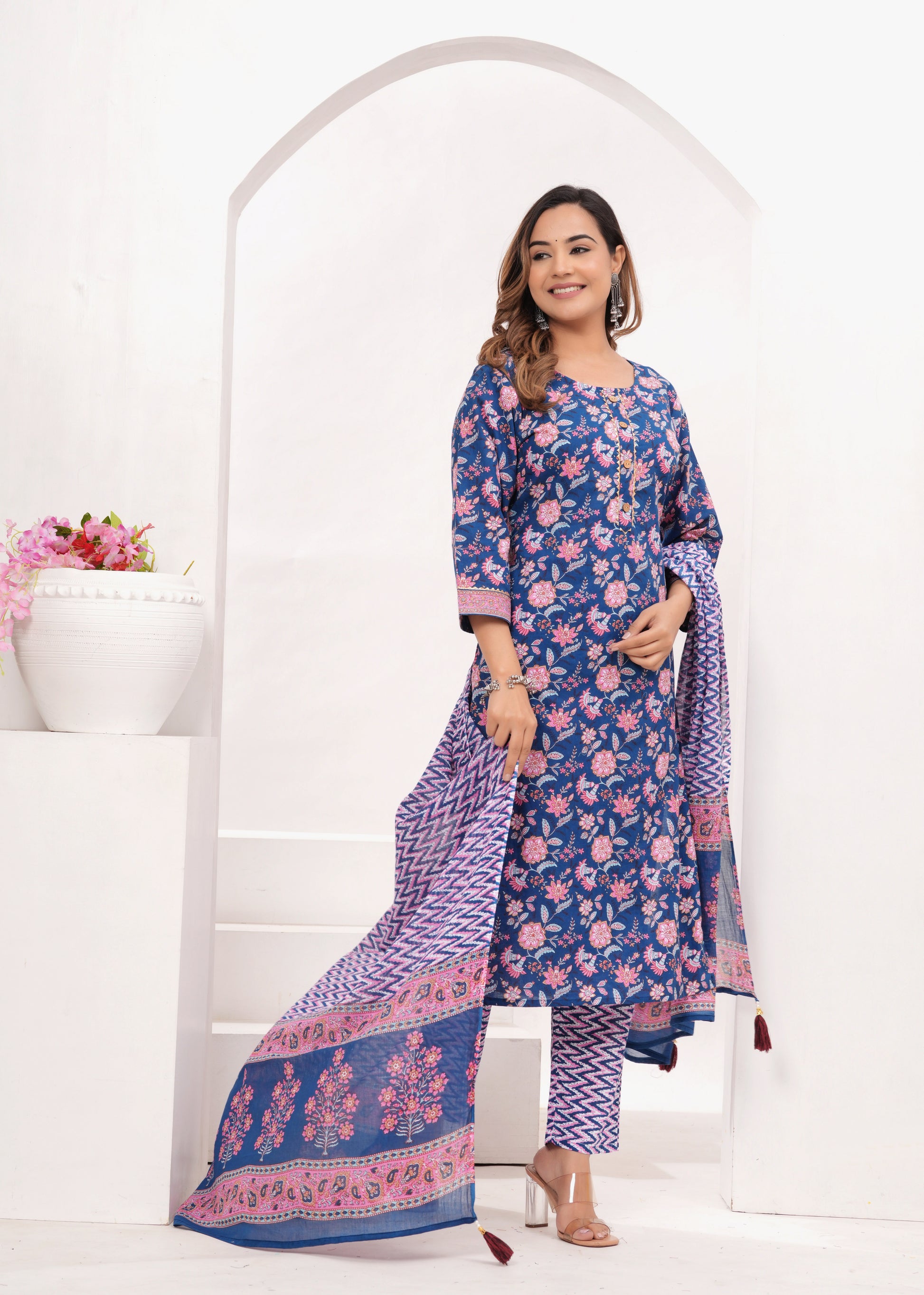 Show off your refined taste in ethnic wear with out beautiful hand made suits. The straight suit set Kurta complements the look, and Mul Mul dupatta makes you look regal. The 3/4 sleeves go well with the print. Style the suit with silver Jhumkis and matching Kangans for an evening function.