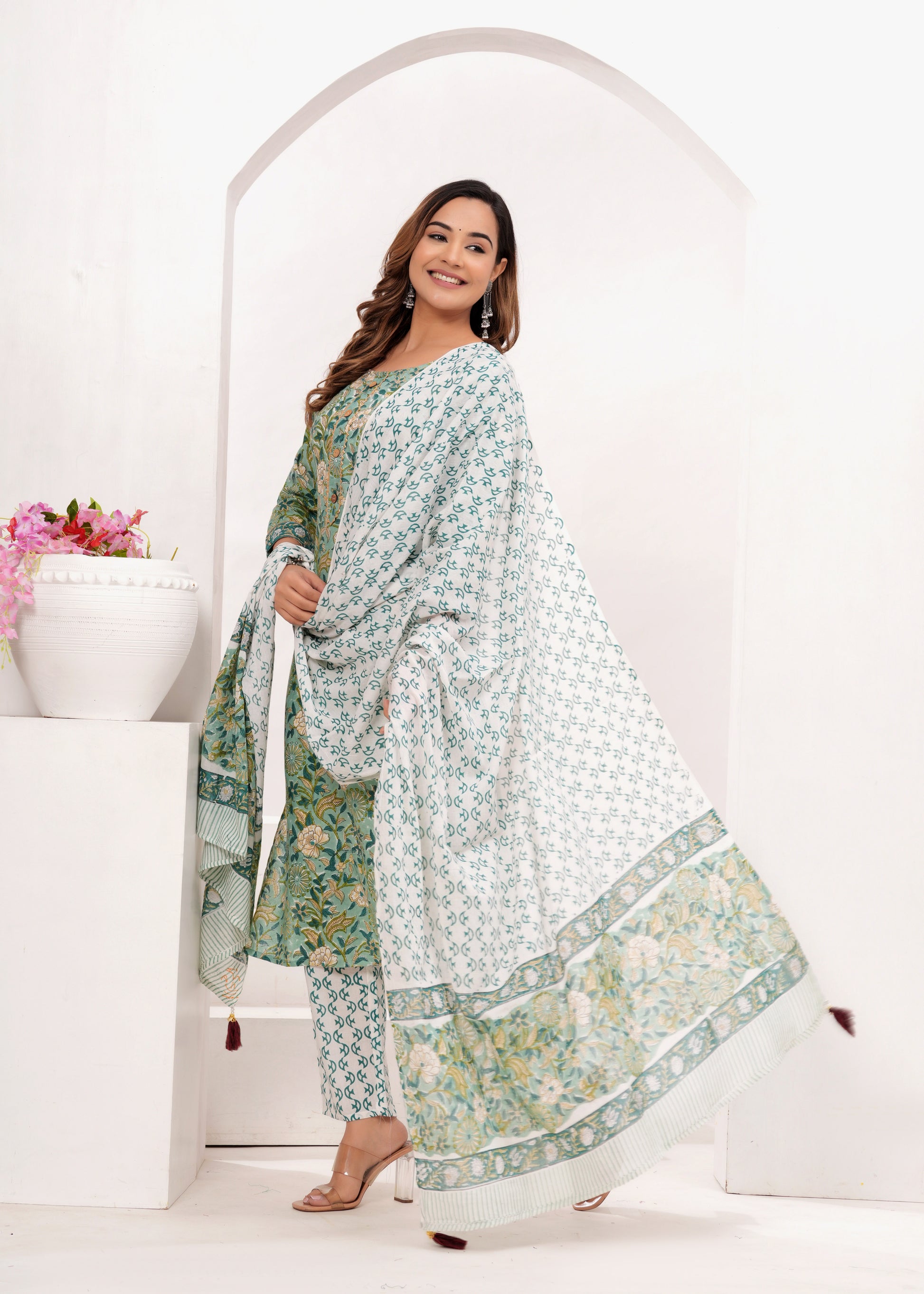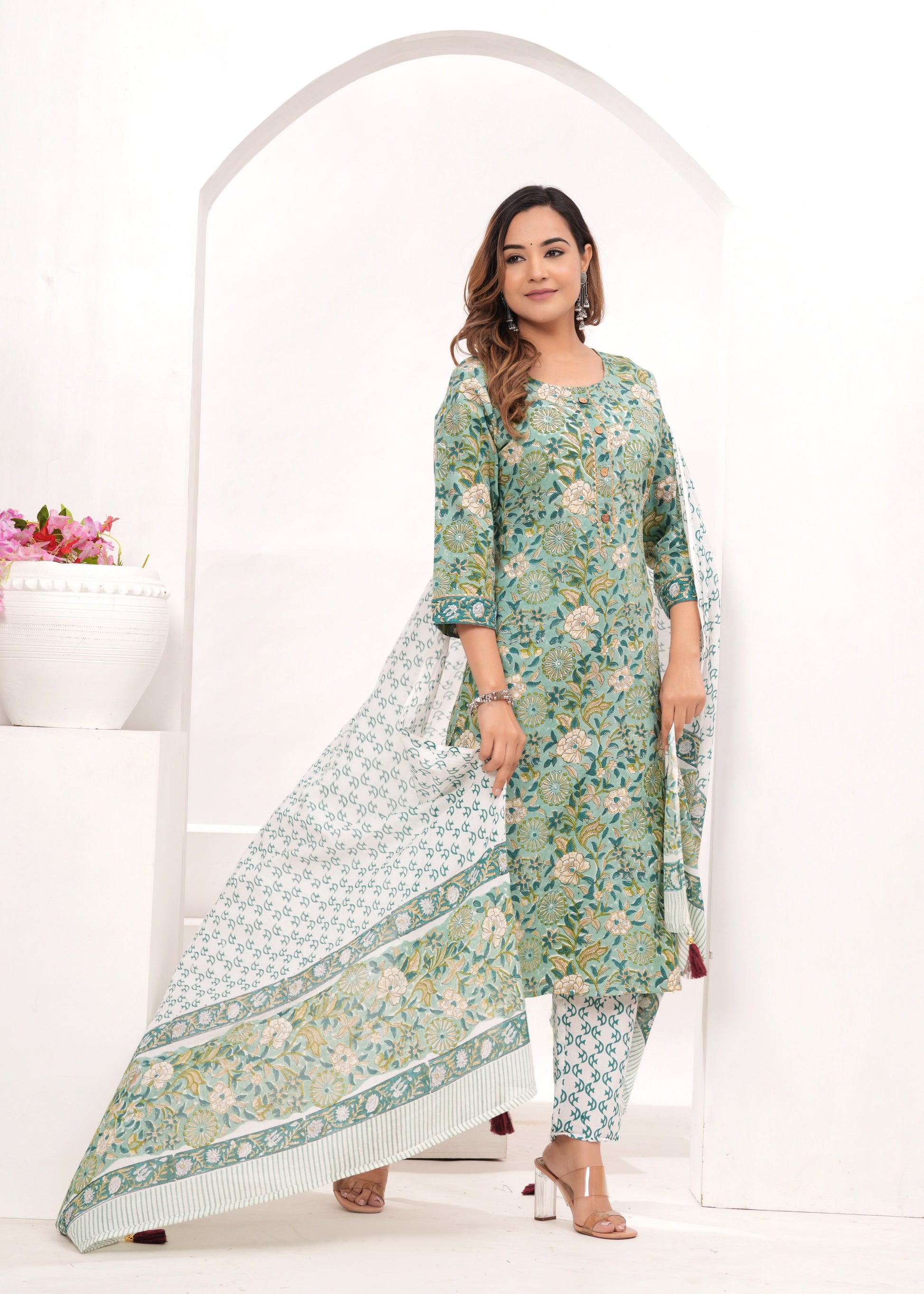 Show off your refined taste in ethnic wear with out beautiful hand made suits. The straight suit set Kurta complements the look, and Mul Mul dupatta makes you look regal. The 3/4 sleeves go well with the print. Style the suit with silver Jhumkis and matching Kangans for an evening function.
