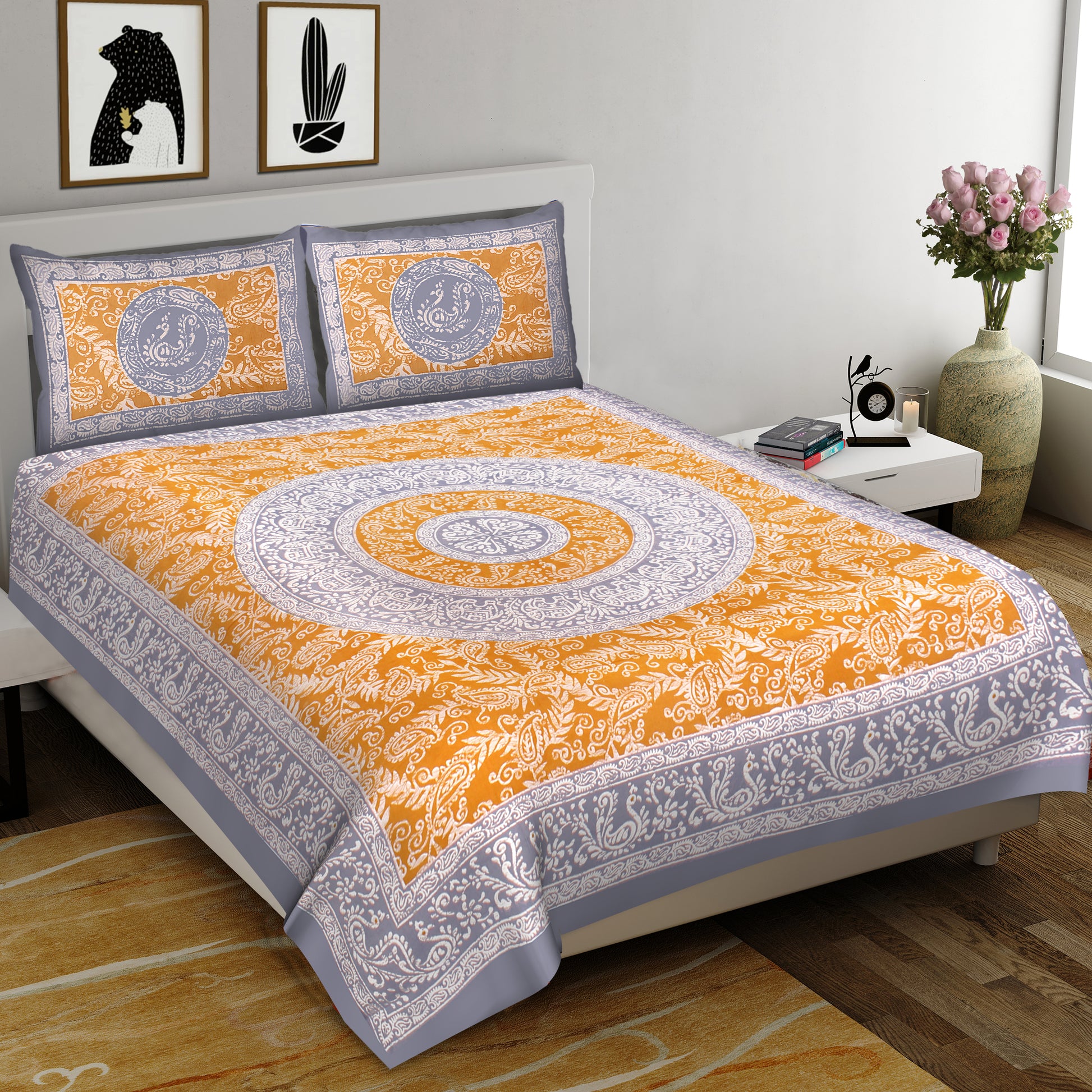 Style your bedroom with this vibrant cotton jaipuri print bedsheet set exclusively designed to make artsy statement. The jaipuri-printed bed sheets feature traditional-themed floral patterns in lively hues. Also, the 100% cotton fabric ensures skin-friendliness, easy wash ability and color-fastness. A fine fusion of both comfort and design- this vibrant and ethnic range of bed sheets is all you need for a restful sleep in all the seasons.