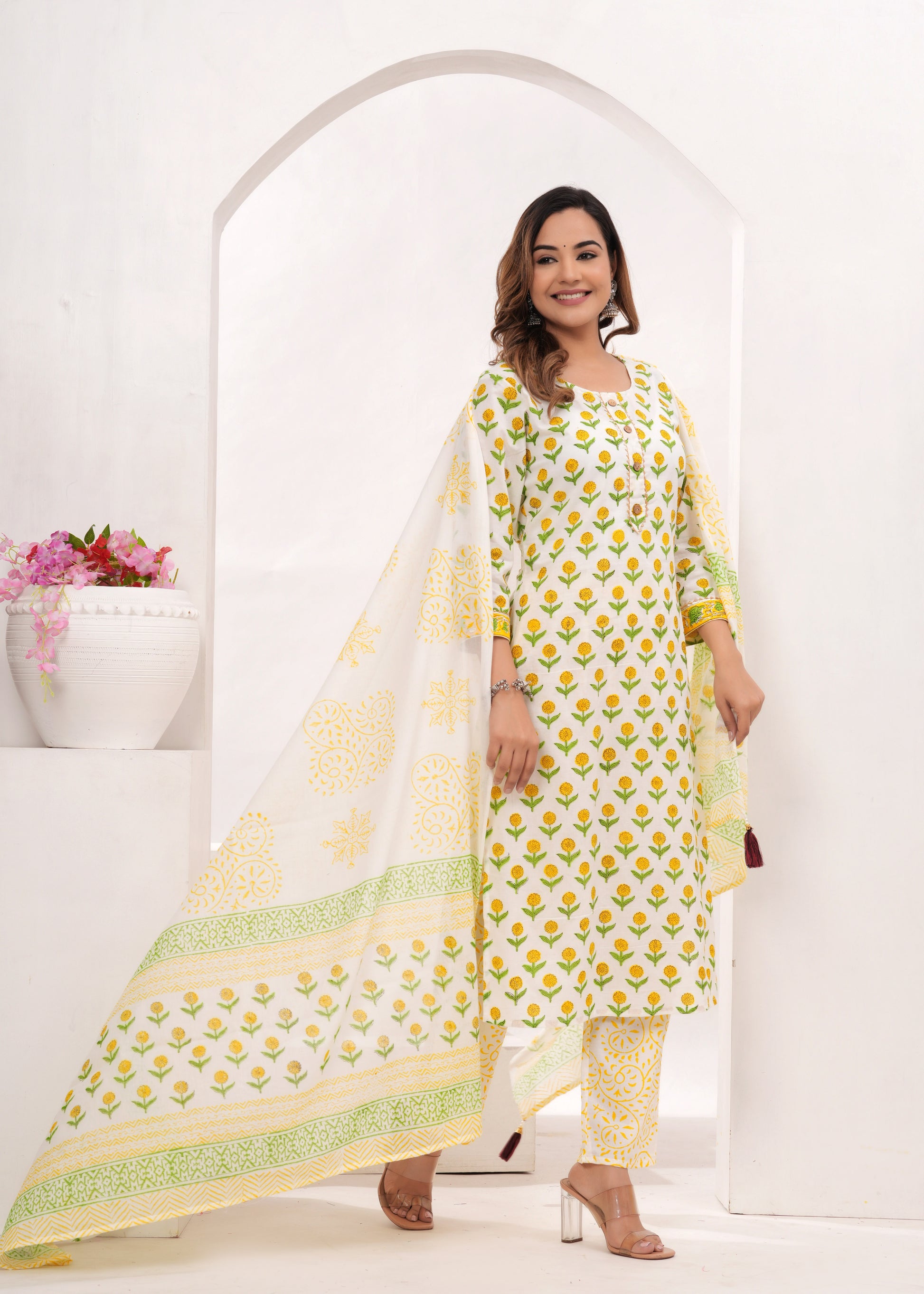 Yellow Butti Hand Block Printed Cotton Suit Set